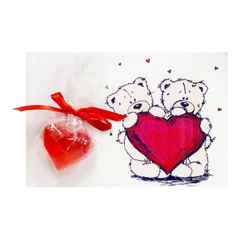 Оригинальный подарок в виде открытки с милым рисунком, к которому прикреплено сувенирное красное мыло в форме сердца, запакованное в пакетик с бантиком.