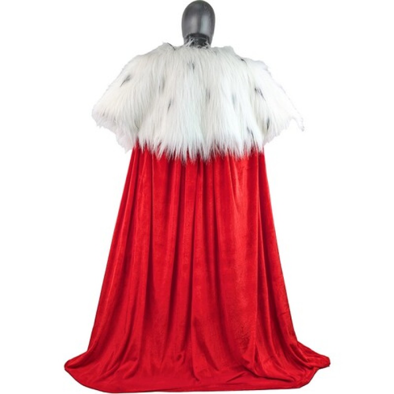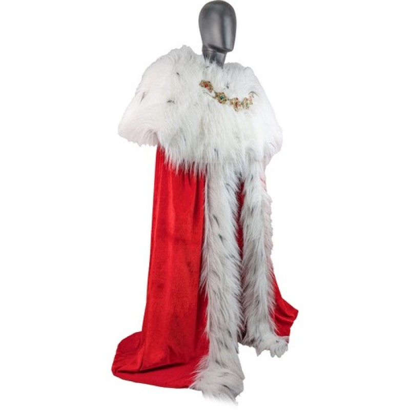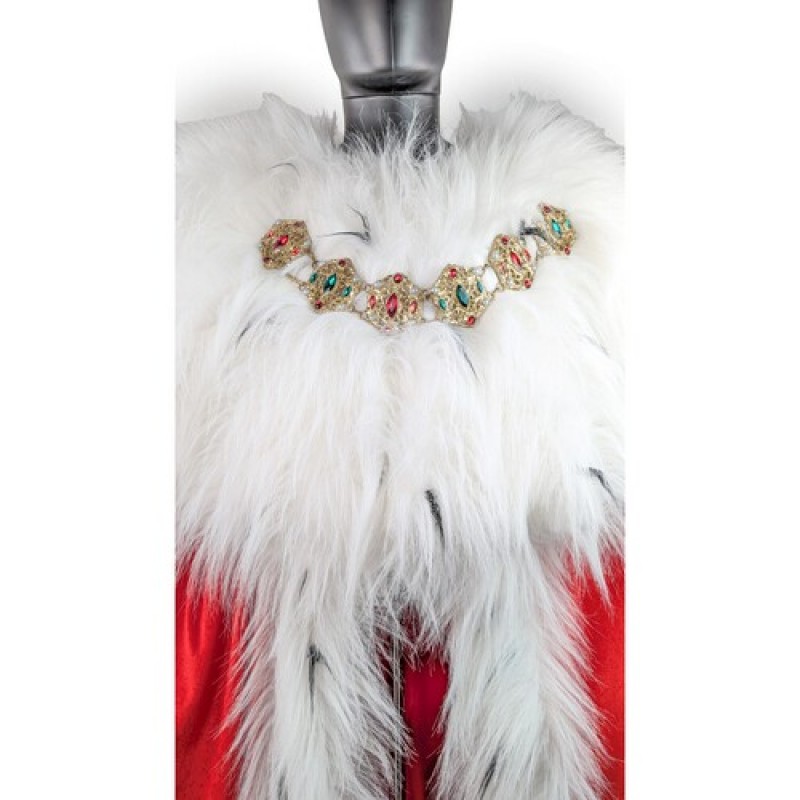 Длинный королевский плащ с белым искусственным мехом и красной атласной подкладкой, декорированный нагрудным колье с массивными элементами в разноцветных камнях.