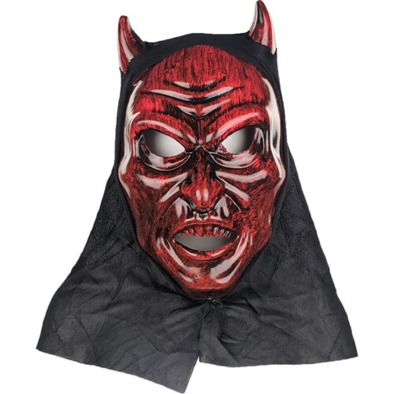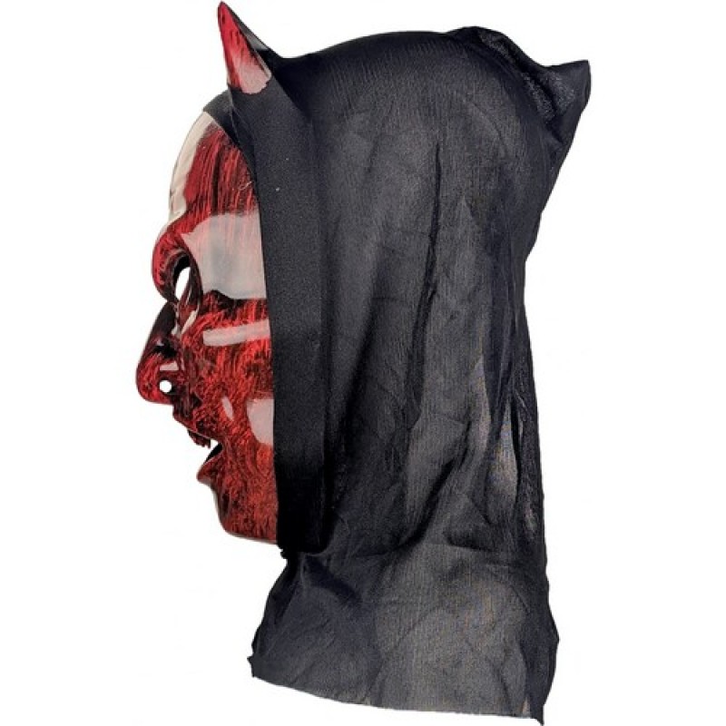 Страшная маска Дьявол красного цвета с капюшоном чёрного цвета. Маска демона, Люцифера, Мефистофеля, черта, беса, нечистого на хэллоуин.