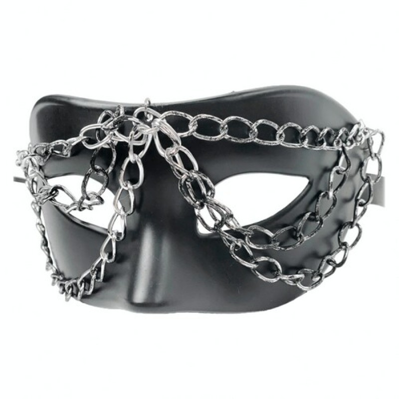 Чёрная пластиковая маска, декорированная цепью - прекрасный выбор для вечеринки, фотосессии, бала-маскарада, а также аксессуар на лицо в стиле БДСМ. Фиксируется с помощью чёрных атласных лент.