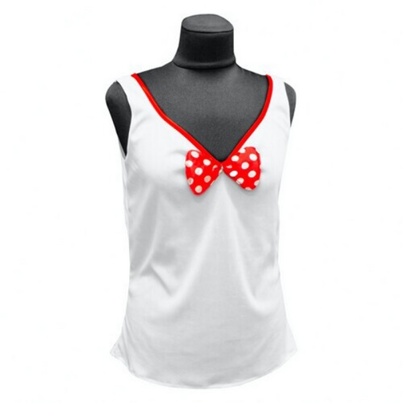 Карнавальная белая майка с красным кантом и красным бантом в белый горошек для образа Минни Маус.