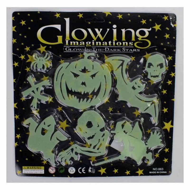В наборе 8 пластиковых наклеек (такие как тыква с гримасой, череп с рукой, привидение, ведьма на метле, скелет, паук, летучая мышь), которые светятся в темноте. Карнавальные наклейки клеятся с помощью двустороннего скотча (в комплекте меленькие кружочки).