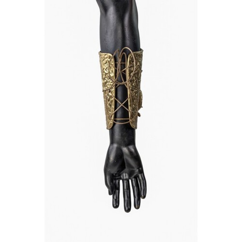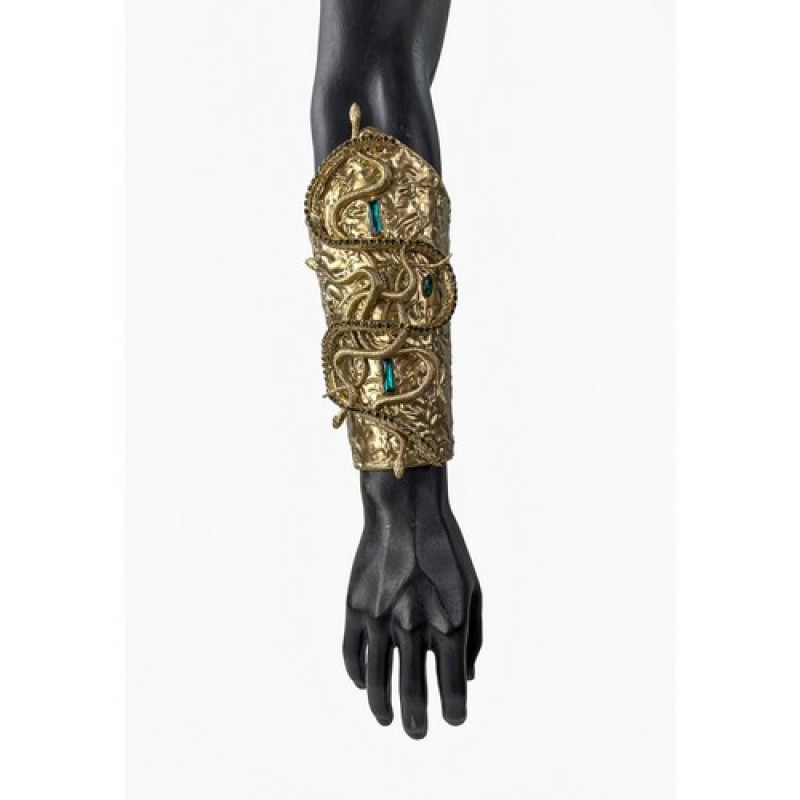 Карнавальный аксессуар в виде нарукавника (браслета, наруча), декорирован извивающимися змейками, изумрудными камнями и стразовой лентой, фиксируется с помощью шнуровки.