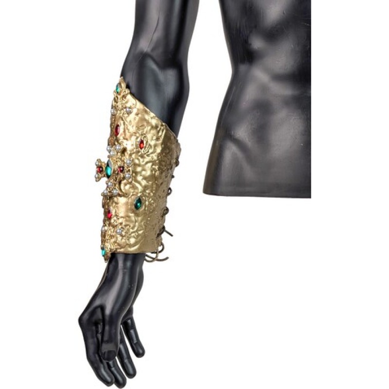 Карнавальный аксессуар в виде нарукавника (браслета, наруча), декорированный металлическими деталями и камнями в зеленом и красном цветах, фиксируется с помощью шнуровки.