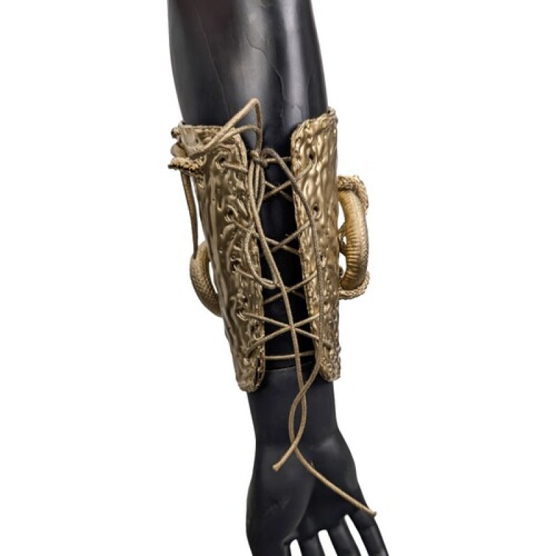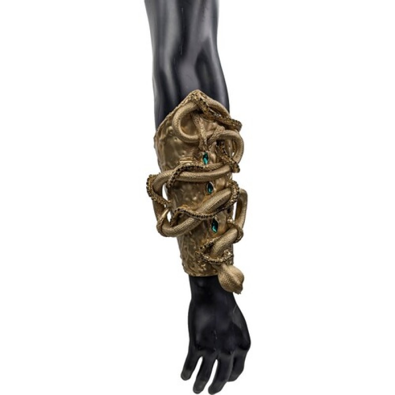 Карнавальный аксессуар в виде нарукавника (браслета, наруча), декорирован змеей в виде кобры, зелеными камнями и стразовой лентой, фиксируется с помощью шнуровки.