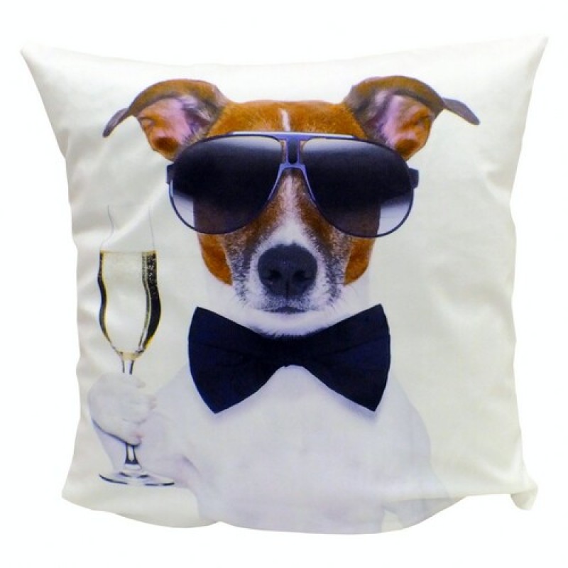 Оригинальная стильная молодёжная наволочка на подушку на молнии с принтом песика джентльмена. Рисунок только с одной стороны. С другой стороны наволочка белая, без рисунка.