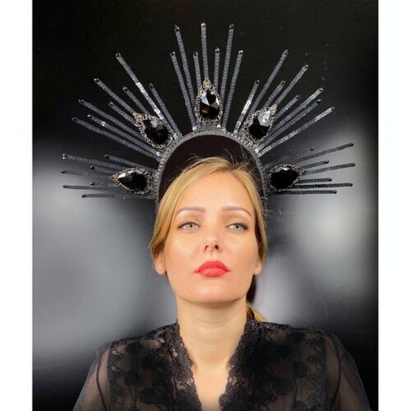 Оригинальный аксессуар в виде двойного обруча, декорированного пластиковыми лучами, пайетками и стразами . Этот головной убор - великолепный выбор для фотосессии, готической вечеринки, для дополнения карнавального образа на Хэллоуин: злая колдунья, тёмная королева, ведьма, богиня. Размер универсальный.