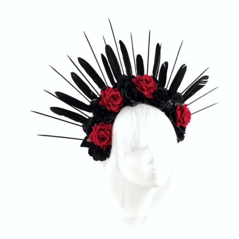 Обруч, декорированный чёрно-красными цветами, пластиковыми лучами и перьями, подойдёт Вам для карнавального образа Санта Муэрте (Санта Муерте, Santa Muerte) на костюмированную вечеринку, Хэллоуин.
