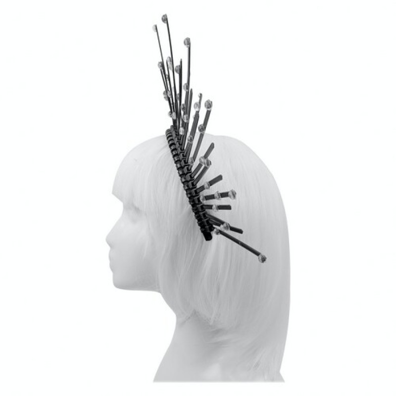 Оригинальный аксессуар в виде обруча, декорированного пластиковыми чёрными лучами и прозрачными пластиковыми камнями кабошонами. Этот головной убор - великолепный выбор для фотосессии, готической вечеринки, для дополнения карнавального образа на Хэллоуин: злая колдунья, тёмная королева, королева ночи, ведьма. Размер универсальный.