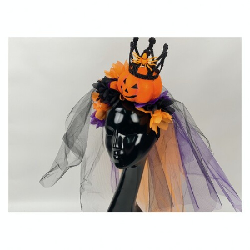 Улыбающаяся яркая тыква на обруче, декорированная фатой, короной и цветами - карнавальный аксессуар на праздник Хэллоуин.