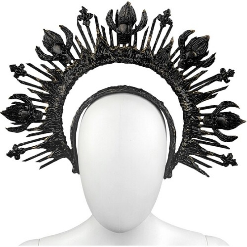 Готический головной убор украшен черепами, лучами, имитирующими пламя, декоративными камнями и блестками.