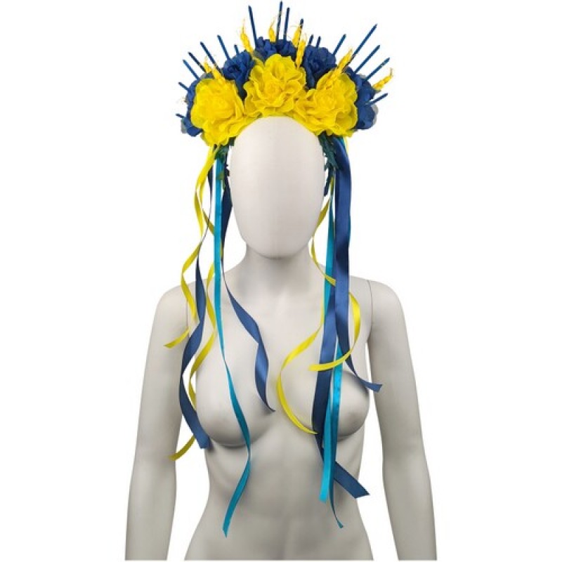 Оригинальный головной убор, украшенный большими яркими желто-голубыми розами, желтыми колосками и лучами (пластиковыми зятяжками).