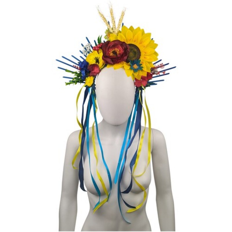 Роскошный головной убор, украшенный большим ярким подсолнухом, маками, желтыми колосьями, мелкими цветами, лучами (пластиковыми стяжками).