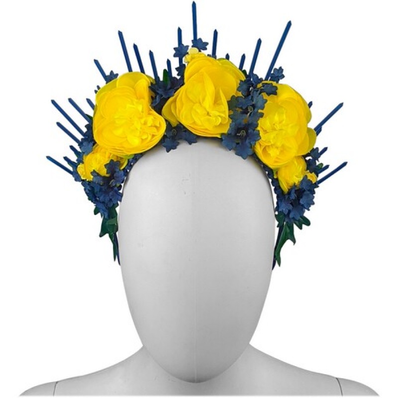 Нежный головной убор, украшенный желто-голубыми цветами, листьями и лучами (пластиковыми зятяжками).