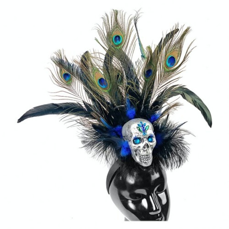Обруч безрозмерный, украшенный серебристым черепом и перьями, подойдёт Вам для карнавального образа Санта Муэрте (Санта Муерте, Santa Muerte) на костюмированную вечеринку, Хэллоуин. Данный аксессуар поможет Вам ощутить себя королевой вечеринки и создать атмосферу праздника.