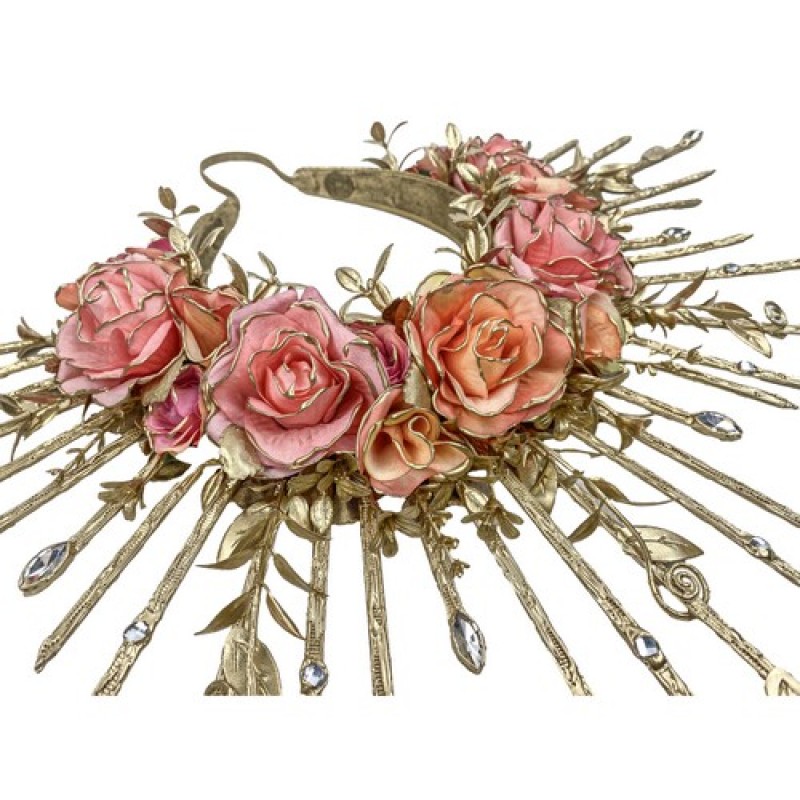 Оригинальный аксессуар в виде обруча, декорированного пластиковыми золотистыми лучами, розовыми розочками, камнями и декоративными ветвями в виде листочков.