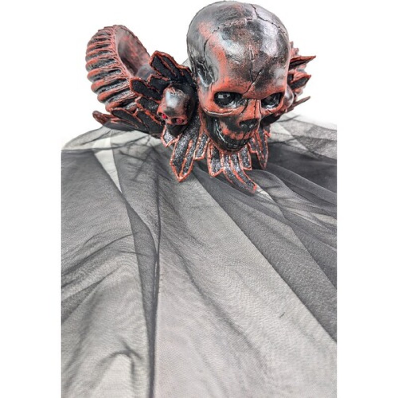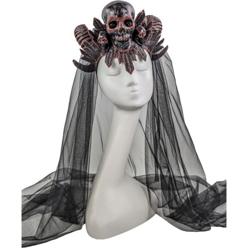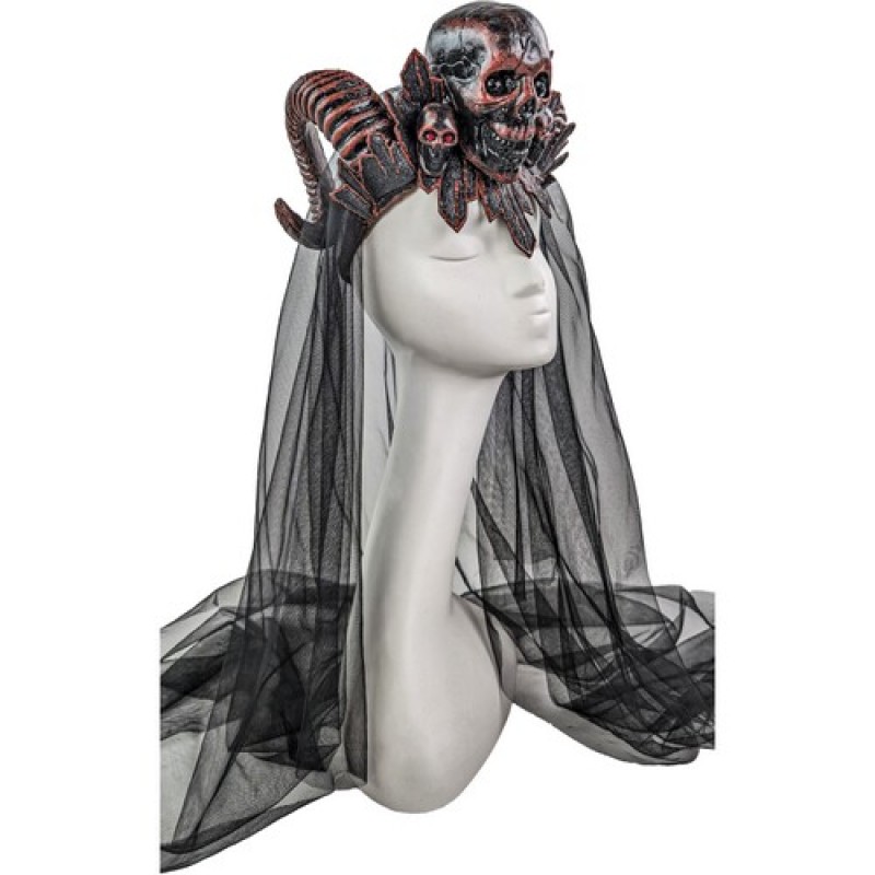 Стильный широкий обруч, декорированный закрученными рогами, композицией из черепов с каменным взглядом и длинной фатой поможет создать оригинальные карнавальные образы для вечеринок (мифический персонаж, готическая фея, дьяволица).
