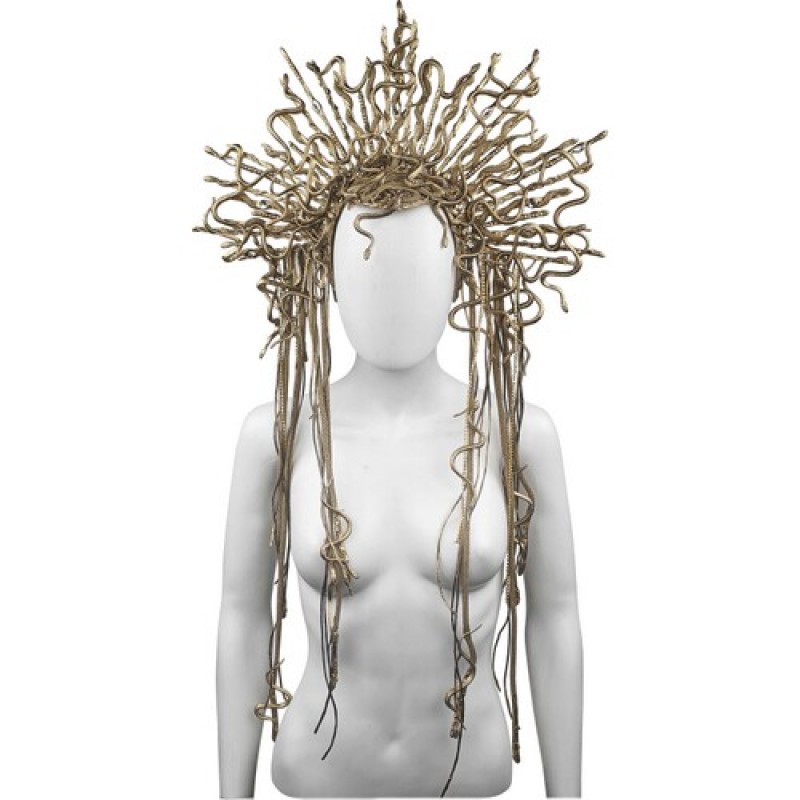 Невероятно красивый головной убор, декорированный лучами (пластиковыми стяжками), золотистыми кабошонами, подвесками в виде декоративной тесьмы, лентой из камней и причудливо извивающимися змеями. Этот великолепный головной убор - прекрасное дополнение к карнавальному образу богини Горгоны, а также прекрасный выбор для фотосессии, тематической вечеринки, поможет создасть величественный, роскошый и незабываемый образ на Хэллоуин, фестиваль, тематическую вечеринку, фотосессию.