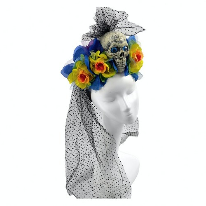 Обруч , украшенный черепом, яркими цветами и фатой.