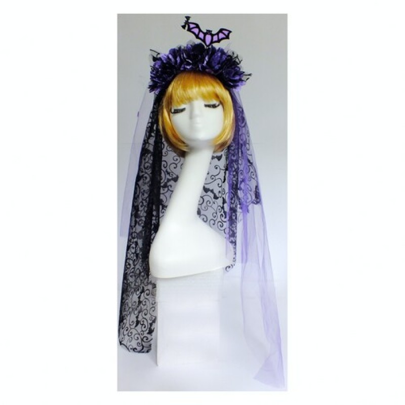 Цветы на обруче с летучей мышью и длинной фатой для карнавального образа на Хэллоуин (Halloween).