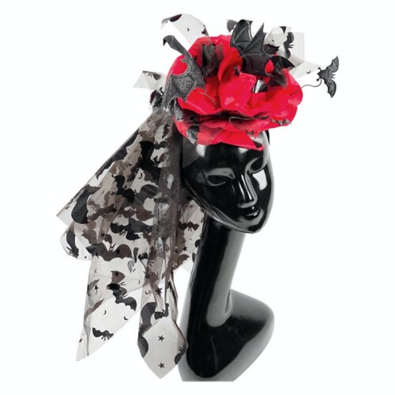 Эксклюзивный дизайнерский аксессуар в виде обруча, декорированного большой красной розой, летучими мышками и фатой, поможет создать неповторимый и оригинальный образ на Хэллоуин (Halloween).