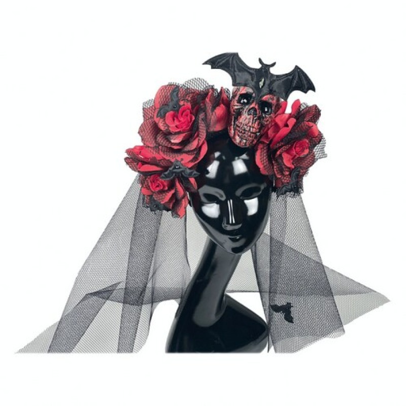 Оригинальный обруч, украшенный черепом с большой летучей мышью, красно-чёрными розами, тремя маленькими летучими мышками, сеткой и фатой. Этот головной убор - отличное дополнение для карнавальных образов королева летучих мышей, королева монстров, королева тьмы, королева загробного мира, на тематическую вечеринку Хэллоуин (Halloween).