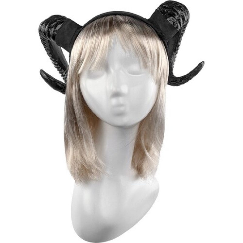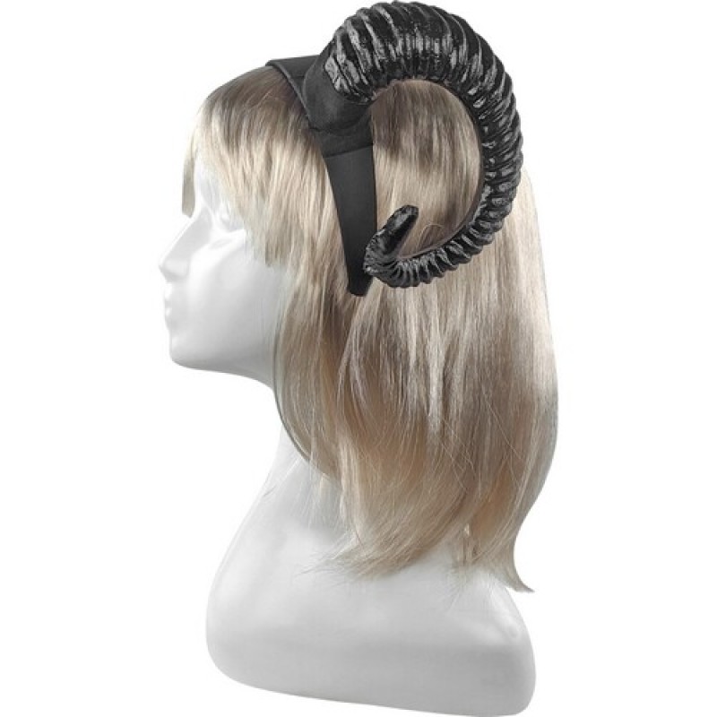 Стильный широкий обруч, декорированный закрученными рогами, поможет создать оригинальные карнавальные образы для вечеринок (овен, баран, мифический персонаж).