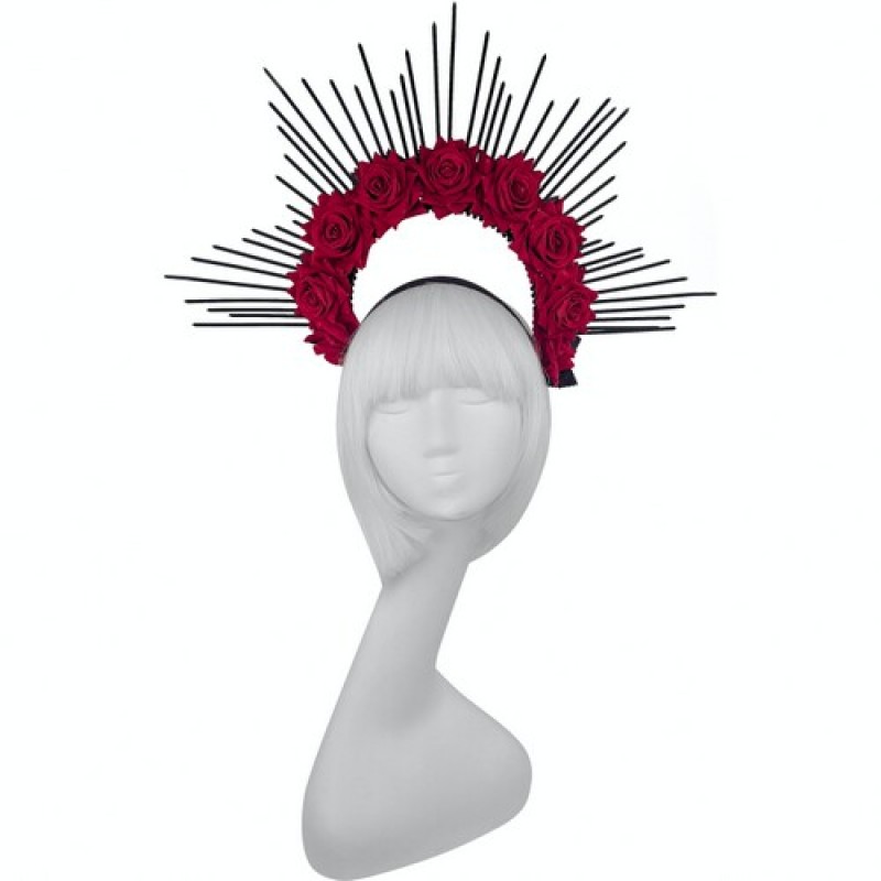 Оригинальный аксессуар в виде двойного обруча, декорированного чёрными пластиковыми лучами и красными розами - великолепный выбор для фотосессии, тематической вечеринки Санта Муэрте (Santa Muerte), дня рождения, а также для дополнения карнавального образа на Хэллоуин. Размер универсальный.