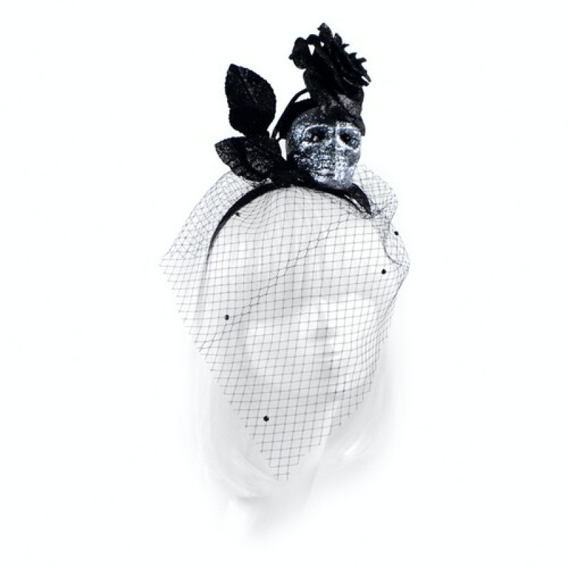 Обруч, декорированный серебристым черепом shine, вуалью - сеткой, чёрной блестящей розой и листьями. Оригинальный аксессуар для карнавального образа на тематическую вечеринку Санта Муэрте (Santa Muerte) , Хэллоуин (Halloween).