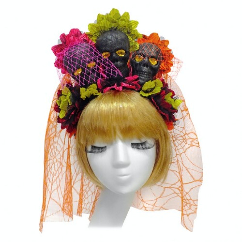 Обруч с тремя черепами и разноцветными цветами подойдёт Вам для карнавального образа Санта Муэрте (Санта Муерте, Santa Muerte) на костюмированную вечеринку, Хэллоуин.
