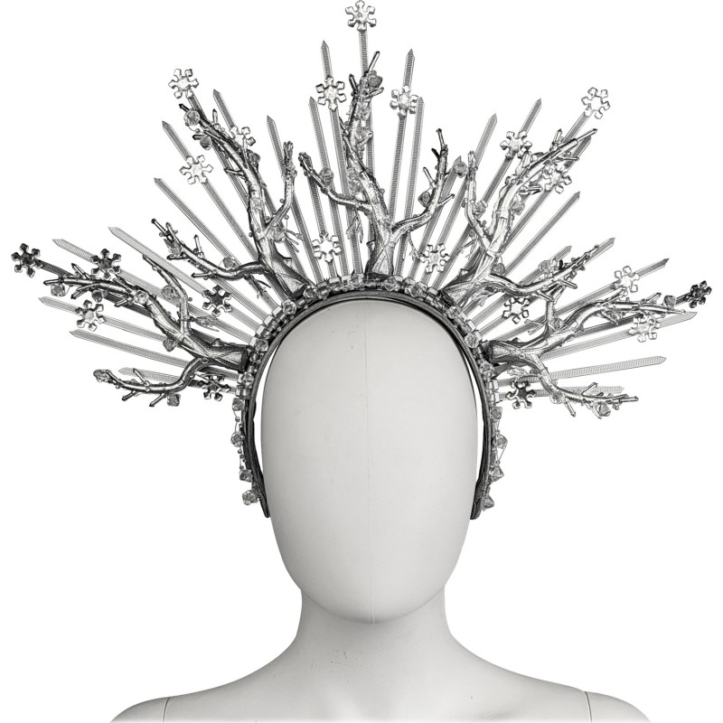Оригинальный аксессуар в виде обруча, декорированного пластиковыми серебристыми лучами, прозрачными снежинками, стразами и декоративными ветвями. Этот головной убор - великолепный выбор для фотосессии, тематической вечеринки, для дополнения карнавального образа: снежная королева, зима, вьюга, ледяная принцесса. Размер универсальный, дополнительно фиксируется с помощью резинки.