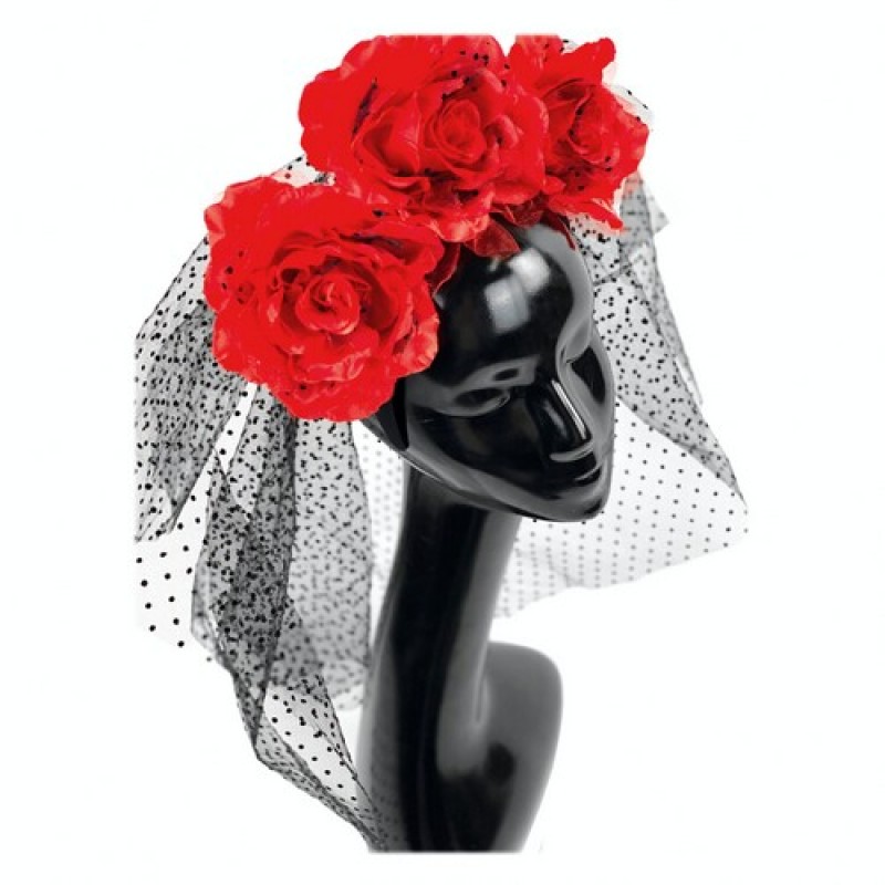 Обруч из крупных красных роз с черной фатой в горошек. Подойдет для образа святой смерти Санта Муэрте, а также для образа испанки (муерте, муэртэ).