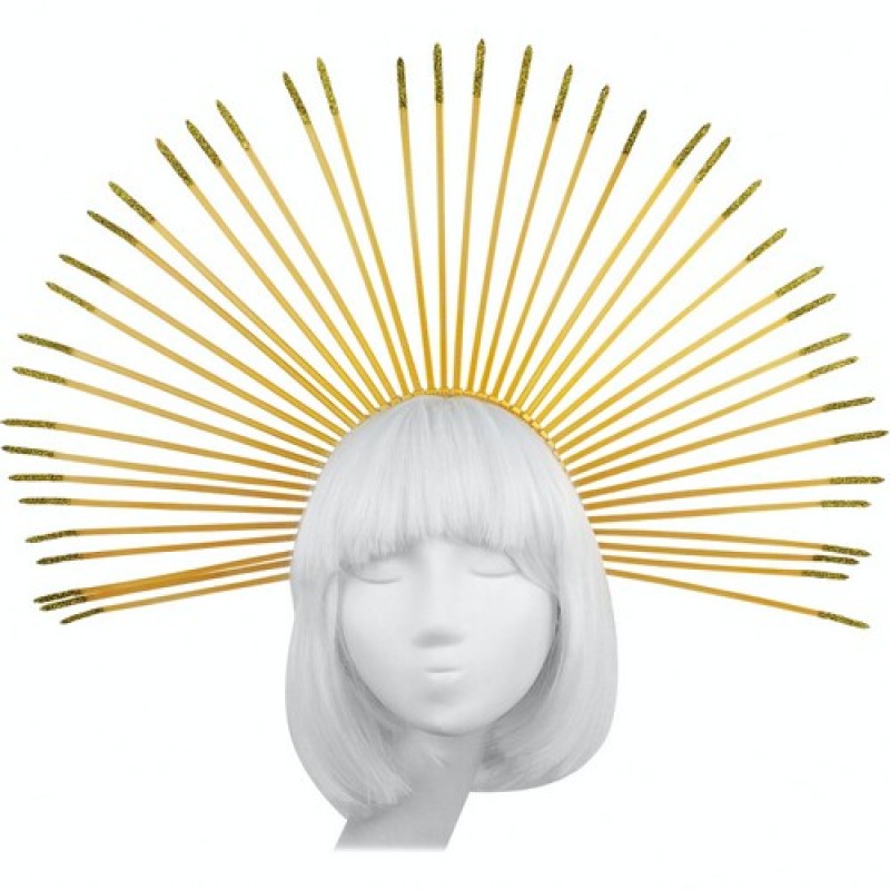Оригинальный аксессуар в виде обруча, декорированного пластиковыми золотистыми лучами. Этот головной убор - великолепный выбор для фотосессии, вечеринки, свадьбы, девичника, для дополнения карнавального образа: богиня, фея, солнце, сказочная королева. Размер универсальный, дополнительно фиксируется с помощью тонкой резинки.