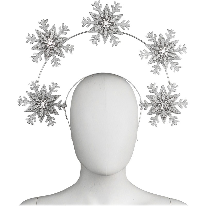 Оригинальный аксессуар в виде двойного металлического обруча, декорированного серебристыми снежинками - великолепный выбор для фотосессии, тематической вечеринки, для дополнения карнавального образа: снежная королева, зима, вьюга, ледяная принцесса. Размер универсальный.