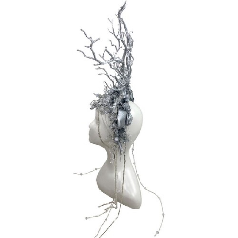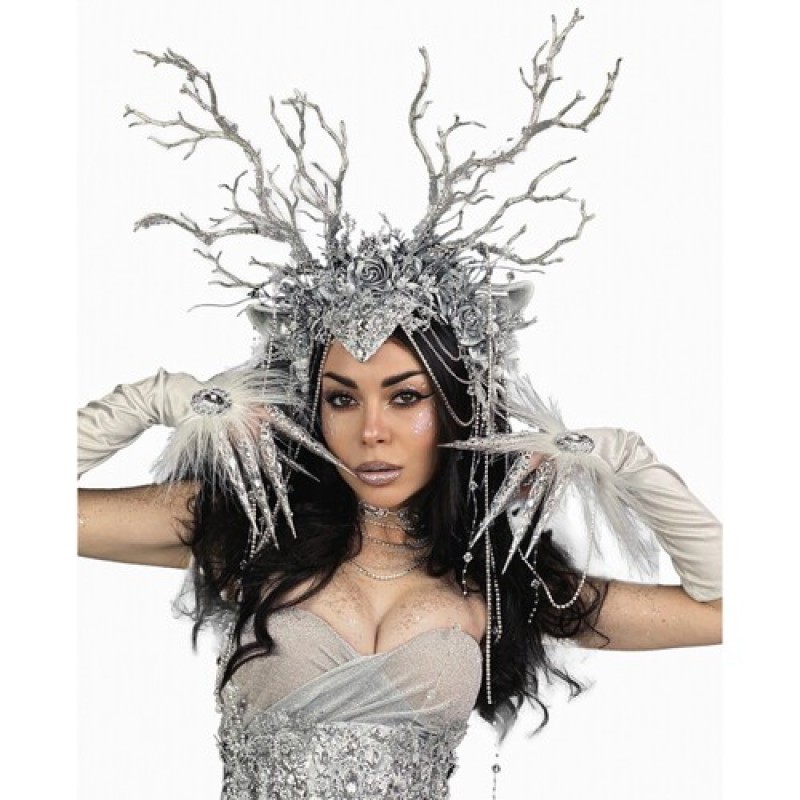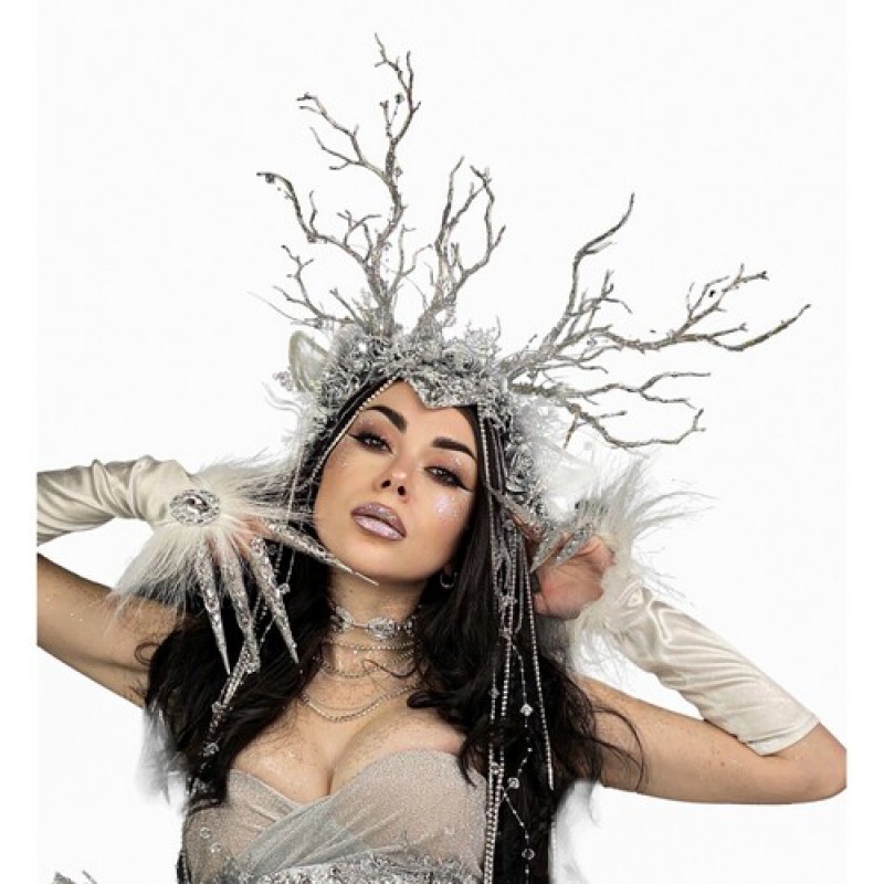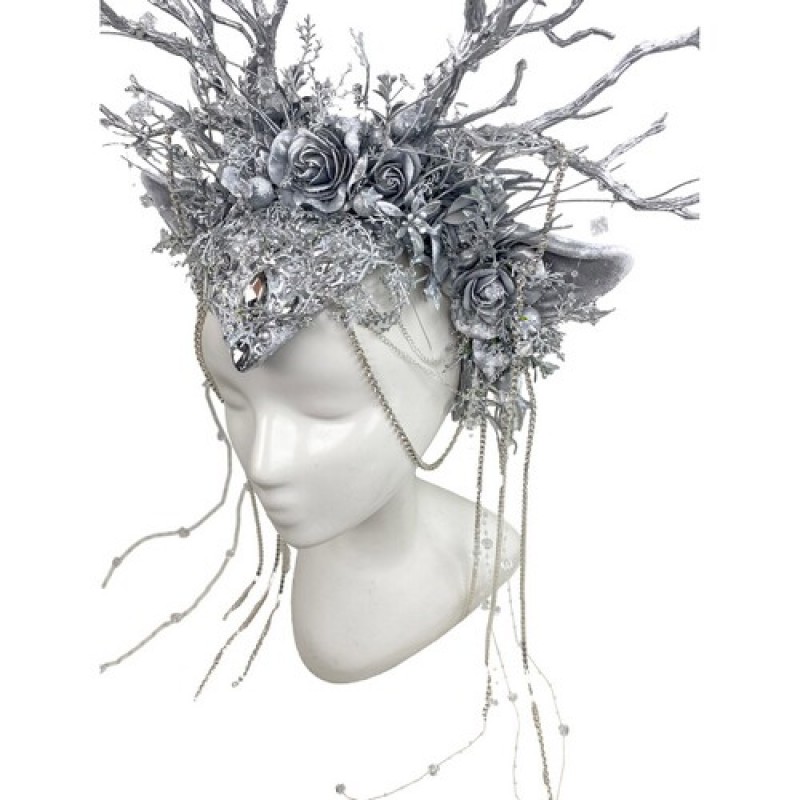 Великолепный зимний головной убор с ушками и ветвями, имитирующими оленьи рога, декорирован розами, веточками, стразами и подвесками.