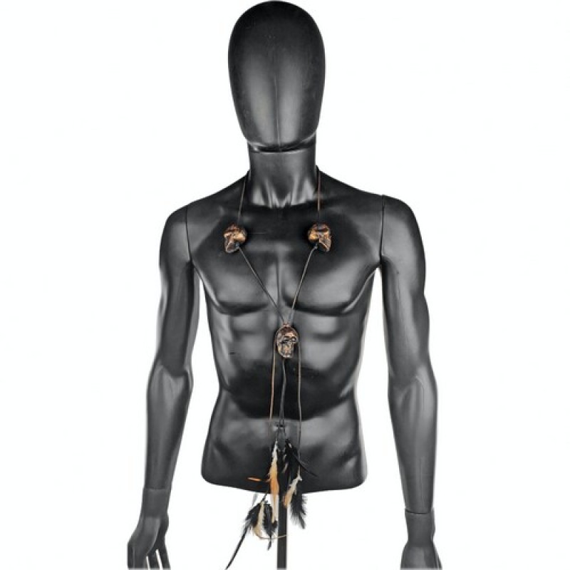 Аксессуар, в виде подвески, декорированной тремя пластиковыми черепами бронзового цвета и перьями, на шнурке - отличный выбор для дополнения карнавального образа: африканский вождь, индеец, шаман, колдун на тематическую вечеринку в стиле Африка, на Хэллоуин (Halloween).