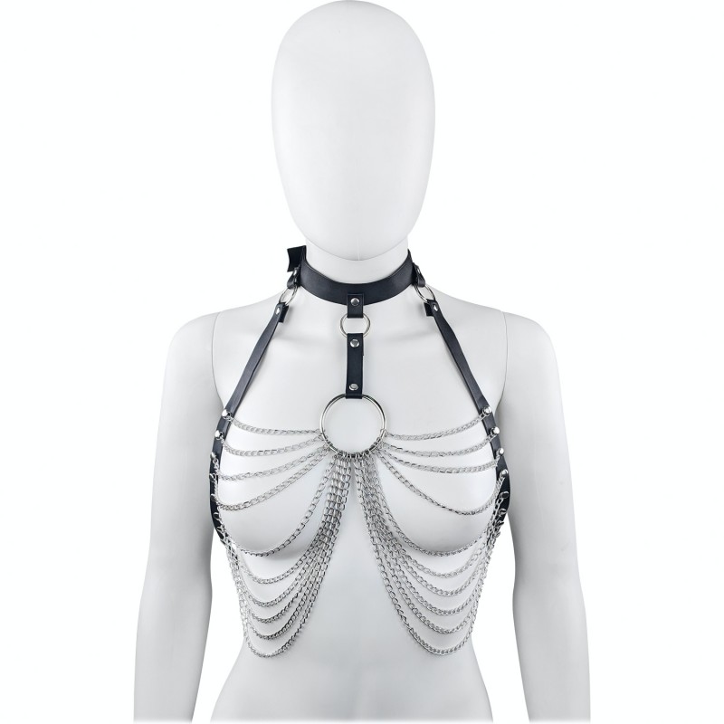 Портупея (портупея с цепями, портупея на грудь и шею) из металлических серебристых цепочек, искусственной кожи и металлических колец. Отлично дополнит готический, деловой и романтический стили.