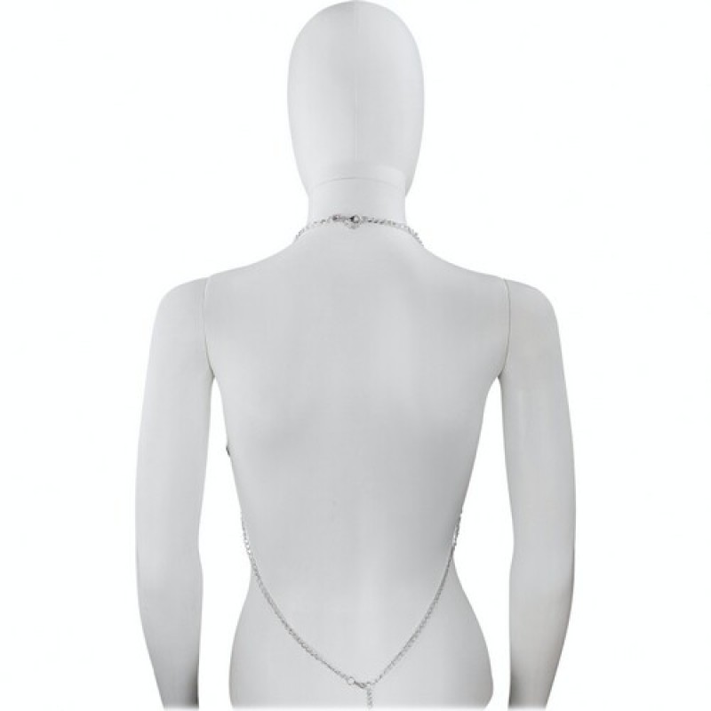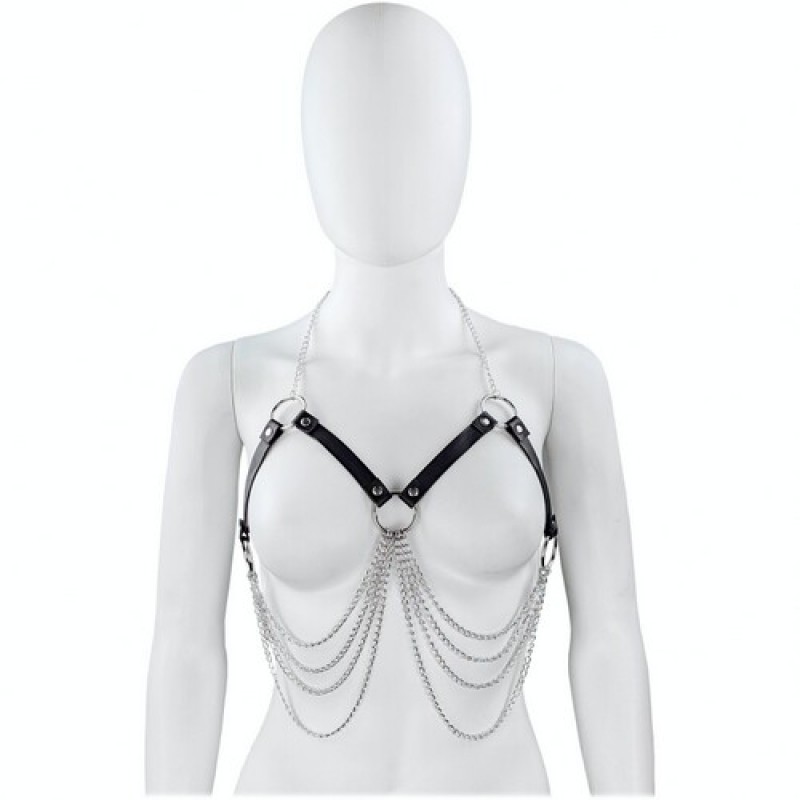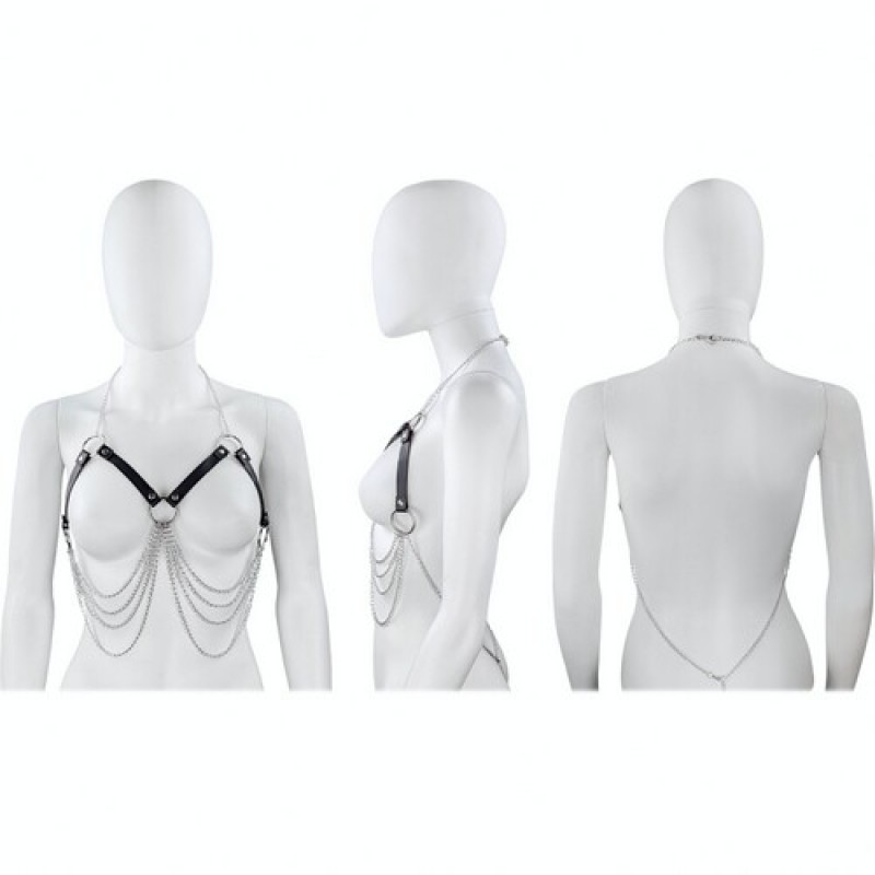 Портупея (портупея на грудь с цепью, портупея на грудь, портупея с цепочками и кольцами) из металлических серебристых цепочек, искусственной кожи и металлических колец. Отлично дополнит готический, деловой и романтический стили.