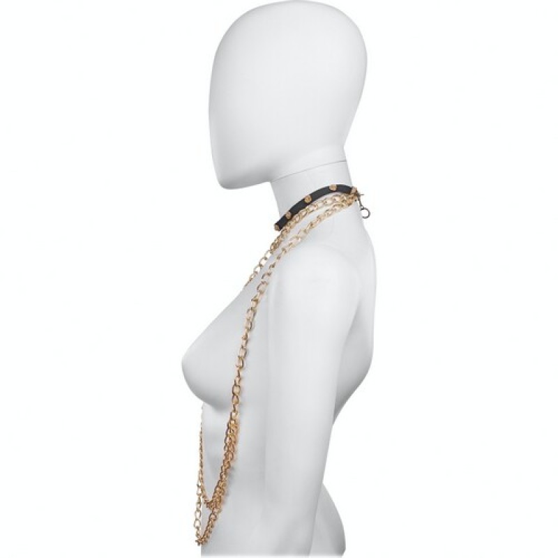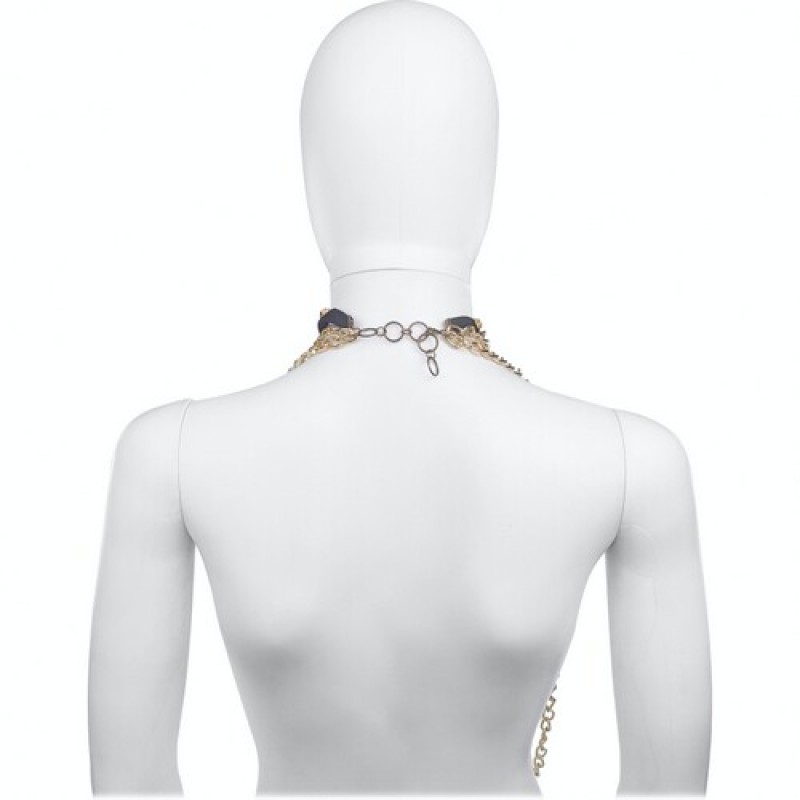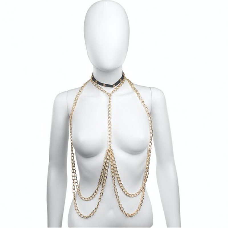 Трендовое украшение портупея (портупея на грудь с цепью, цепи портупея, женская портупея с цепочкой) из металлических золотистых цепочек и искусственной замши.