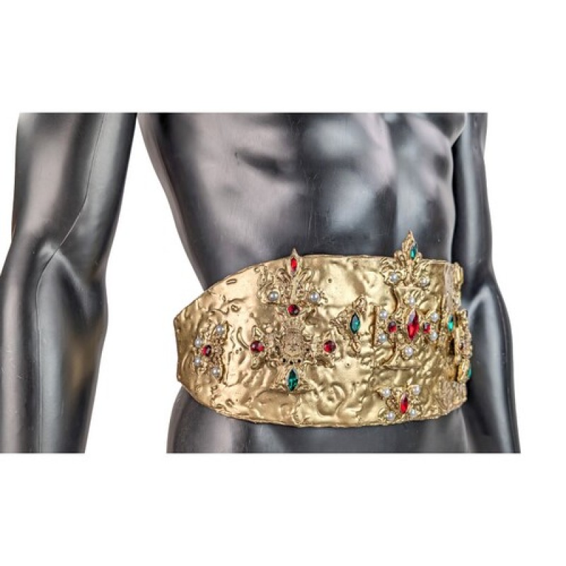 Широкий золотистый пояс, декорированный металлическими деталями и камнями в зеленом и красном цветах.