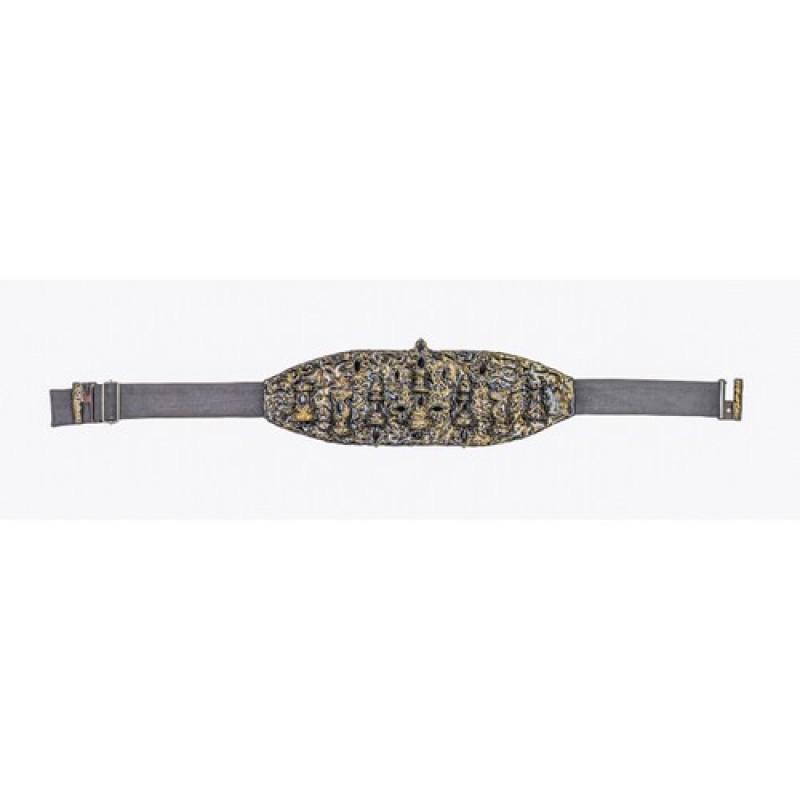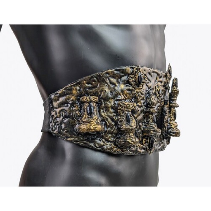 Оригинальный пояс декорирован шахматными деталями с черными камнями и вензелями.