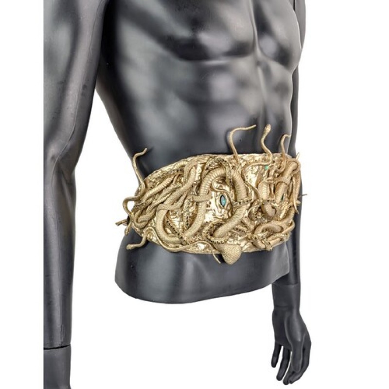 Оригинальный пояс декорирован большими и маленькими змеями, зелеными камнями и стразовой лентой.