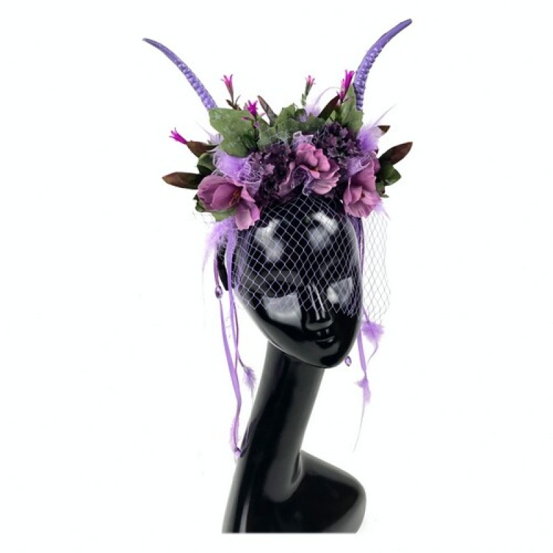 Этот головной убор удивительно красив, украшен рогами, искусственными цветами, соцветиями, перьями и вуалью. Идеально подойдёт для тематических вечеринок, фотосессии, вечеринки в таинственном саду (Secret Garden Party). Поможет дополнить образ антилопы, лесной феи, лесной нимфы.