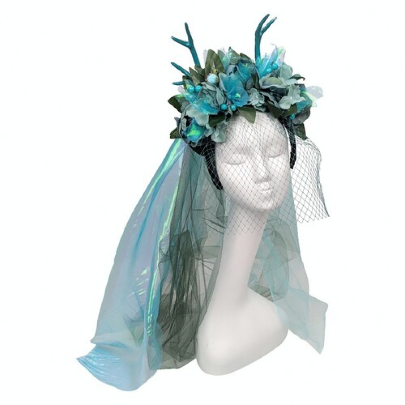 Великолепный обруч оленя, декорированный бабочками shine, стрекозой, цветами, зелеными листьями, ягодками, длинной фатой и французской вуалью. Подойдет для образов олененок, цветочный олень, сказочный олень, лесная фея.