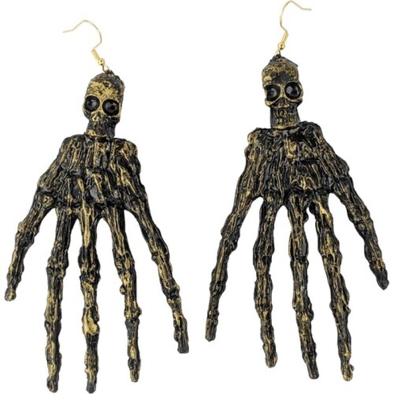 Интересные серьги в оригинальной форме головы скелета с рукой скелета подойдут для создания образа готической мистической дамы, амазонки, верховной жрицы в оккультизме.