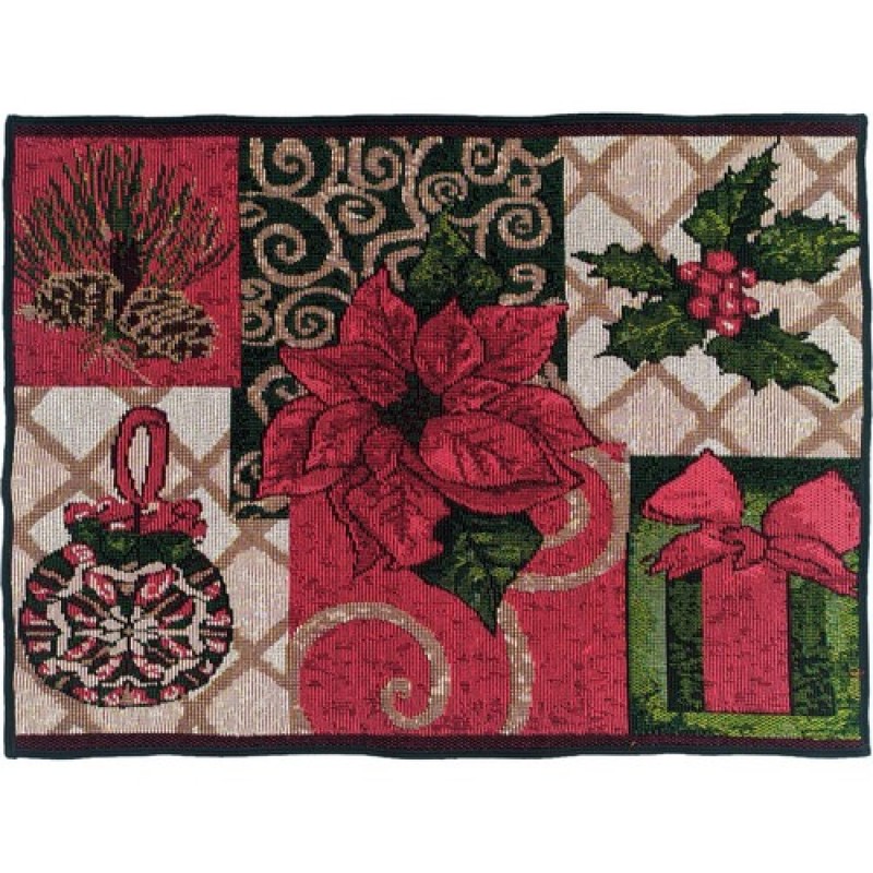 Гобеленовая салфетка с композицией. Пуансеттия на фоне новогоднего декора и подарка.