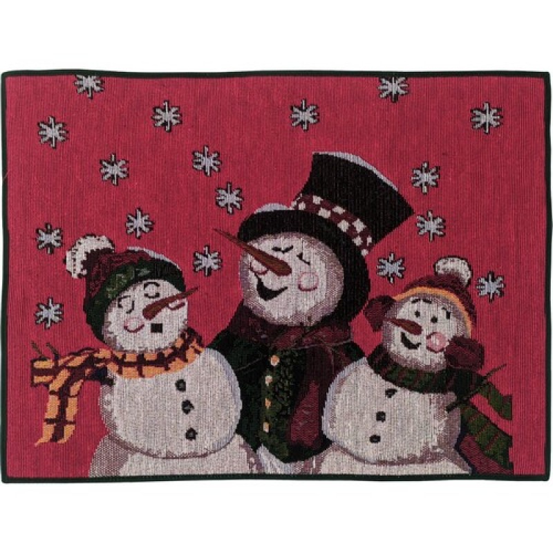 Гобеленовая салфетка с композицией. Зимняя салфетка - три снеговика в шапках и шарфах на красном со снежинками фоне.