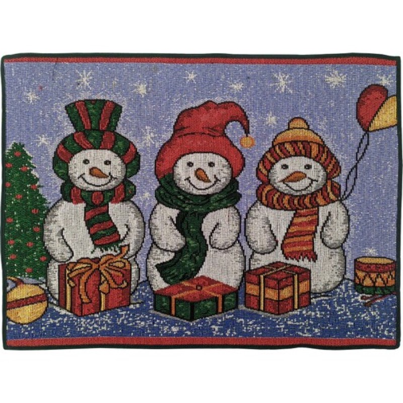Гобеленовая салфетка с композицией. Зимняя салфетка - три снеговика в шапках и шарфах возле елки.