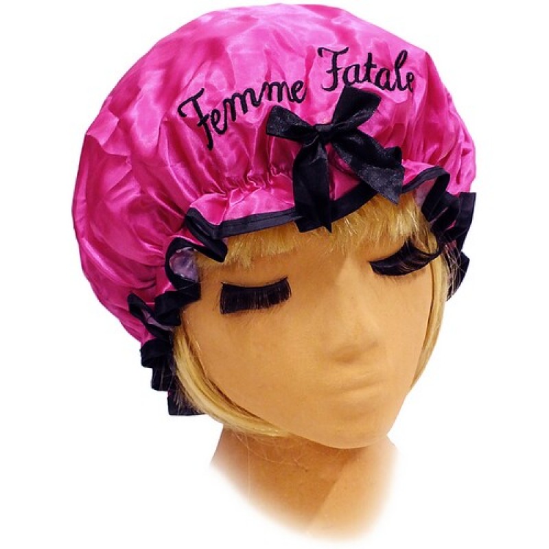 Гламурная шапочка для душа на резинке, с бантиком и надписью-вышивкою: Femme Fatale. Верх шапочки - атласная ткань, внутренняя часть - непромокаемая клеёнка.