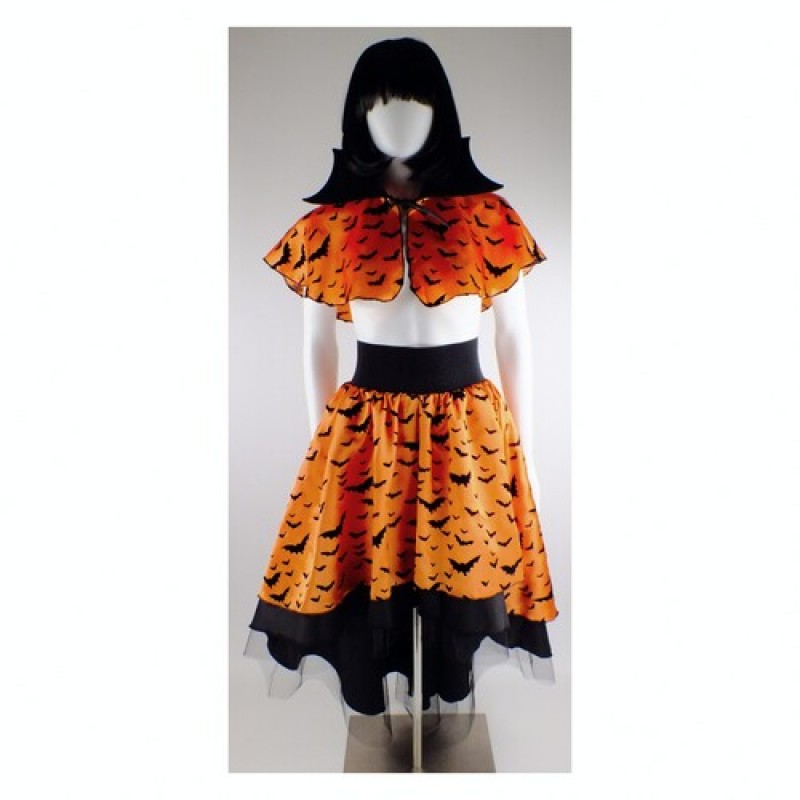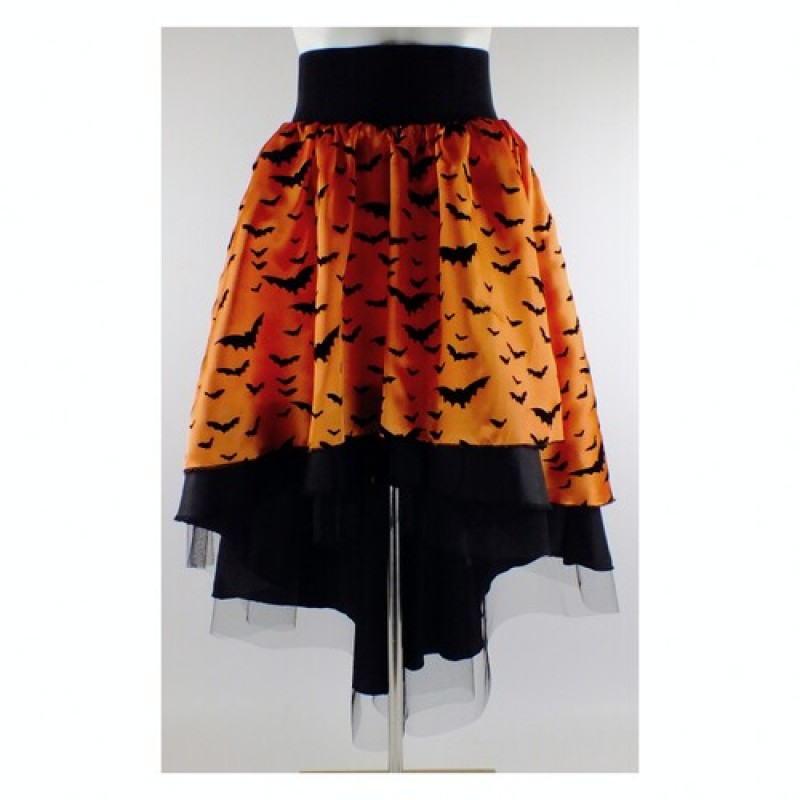 Оригинальная оранжевая юбка с изображением летучих мышей, а также с черным фатиновым подъюбником, для создания неповторимого карнавального образа на Halloween. Подойдет для образа королевы летучих мышей.